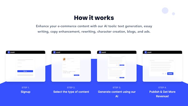 Your E-commerce Storyteller. Let your ideas come to life with captivating copy, engaging blogs, irresistible ads and much more—all powered by AI. Whether you're brainstorming for your next campaign or need fresh content, Smartli weaves the narrative for you.