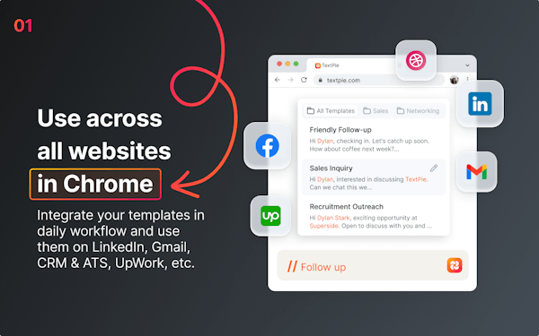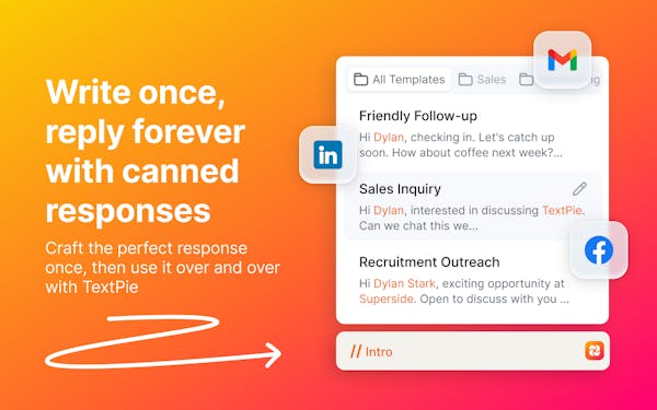 How TextPie Helps: ⚡ Instant Messaging: Create your templates once, then access them instantly with // or our TextPie icon. ✍️ Error-Free Communication: Auto-fill names, dates, and details to ensure accuracy with variables. 💻 Seamless Workflow: No more tab switching—everything is accessible right where you need it.