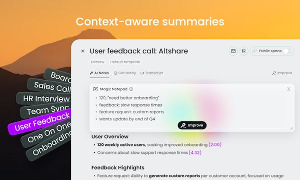 The Magic Notepad brings the human touch back to your meeting notes. You jot down what matters to you, and your AI takes it from there, organizing your raw notes and meeting transcription into structured insights, beautiful formatting, and next steps.