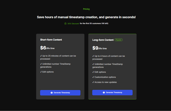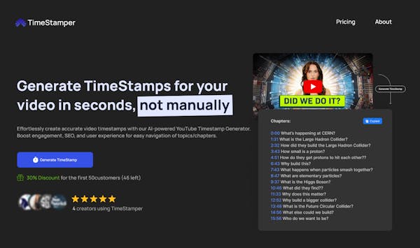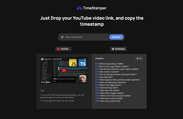 TimeStamper is an AI tool that generates timestamps/chapters for YouTube videos with just a link. It is specifically tailored for long-form content creators to create timestamps in less than 15 seconds, saving hours of manual effort.