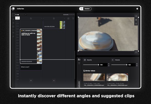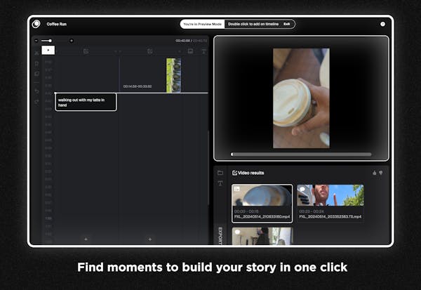 Moonshine enables a fundamentally new and simpler way to create videos. Watch your relevant media float into your timeline as we find what you're looking for and bring your story to life.
